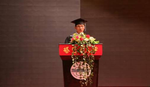 通信工程19-2班的毕业生代表王智博发言,他表示,大学是一个提升能力与技能的殿堂,对于每一个青年成长成才都非常关键,青年人一定要把握好大学四年的每一天,感谢母校给我们的培养。