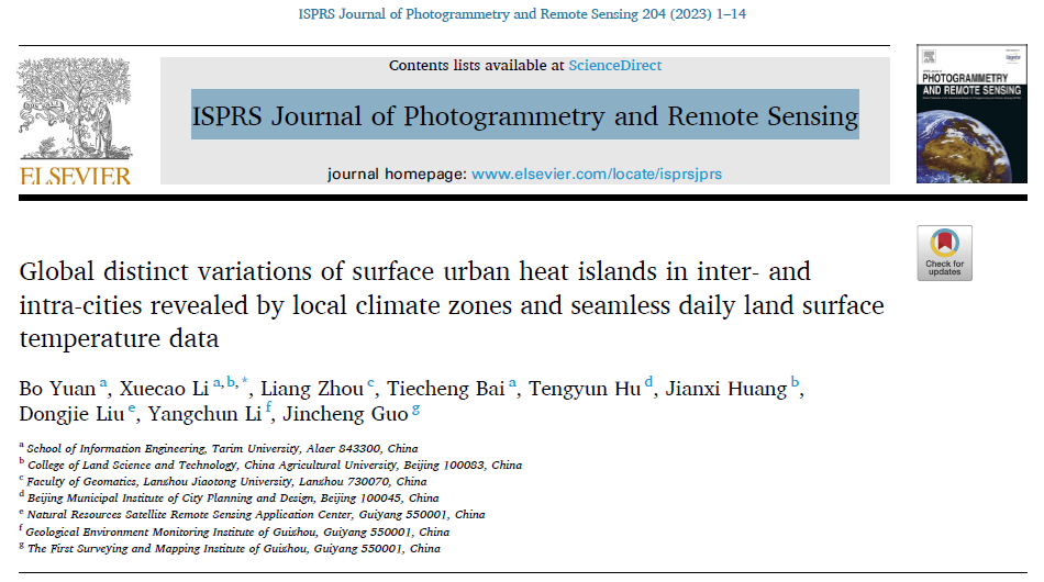 近期,yl23455永利集团白铁成教授团队与公司高层次柔性引进人才李雪草教授以yl23455永利集团为第一单位在遥感顶级期刊《ISPRS Journal of Photogrammetry and Remote Sensing》(SCI,中科院一区,IF:12.7) 正式发表了题为“Global distinct variations of surface urban heat islands in inter- and intra-cities revealed by local climate zones and seamless daily land surface temperature data”的研究论文。该研究基于当地气候带和无缝的每日陆地表面温度数据揭示了城市间和城市内地表热岛的显著变化,为城市科学规划、景观园林和农业可持续发展提供科学依据。