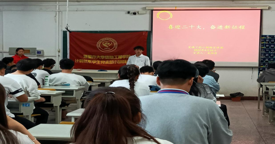 4月26日,信息院计算机系员工党支部“党旗下的小胡杨宣讲团”在二号楼107给计算机科学与技术2021级5、6班开展“喜迎二十大,奋进新征程”主题宣讲。