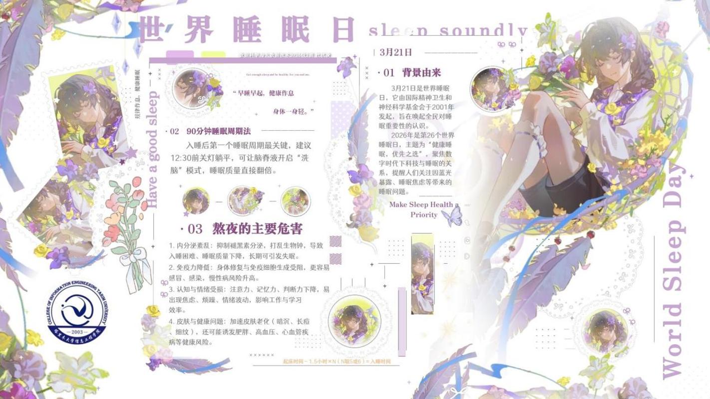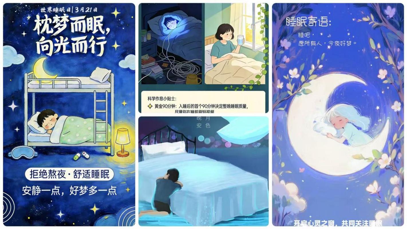 春暖校园,好眠相伴。在世界睡眠日与雷锋月交汇之际,yl23455永利集团“幸福专列・向阳而行”系列活动之“以好眠,赴青春”睡眠健康创意征集活动圆满落幕。活动自3月14日启动,至18日收官,全院100余名学子以雷锋精神为指引,以个人或宿舍为单位踊跃参与,线上线下双渠道并行,用创意海报与温情公约传递科学睡眠理念,营造了健康向上的校园氛围。