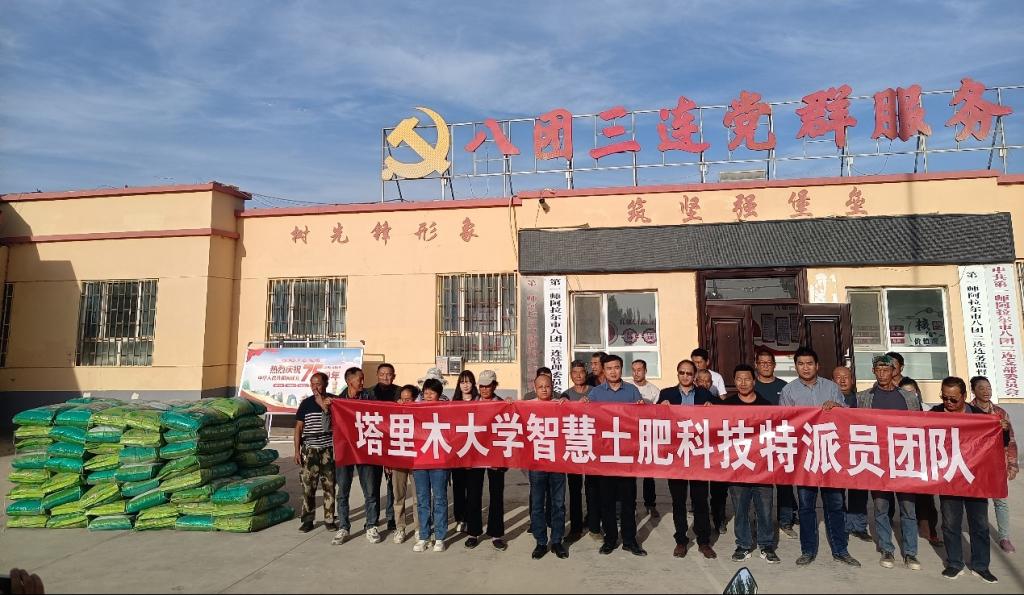 其次,针对沙土多、盐碱重的问题,团队购置一批微生物有机复合肥,以提升土壤肥力和缓解盐碱化,有效支持了职工群众的农业生产。